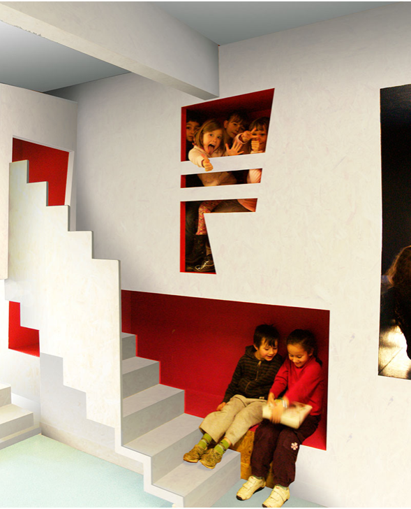 Il définit des zones d’échanges et des zones d’intimité et de repli. On peut s’extraire du groupe tout en restant relié visuellement au reste de l’espace. On peut trouver un territoire pour chaque activité : jeux symboliques, jeux de société, jeux corporels. On peut jouer sans contraindre le corps ni ses mouvements.